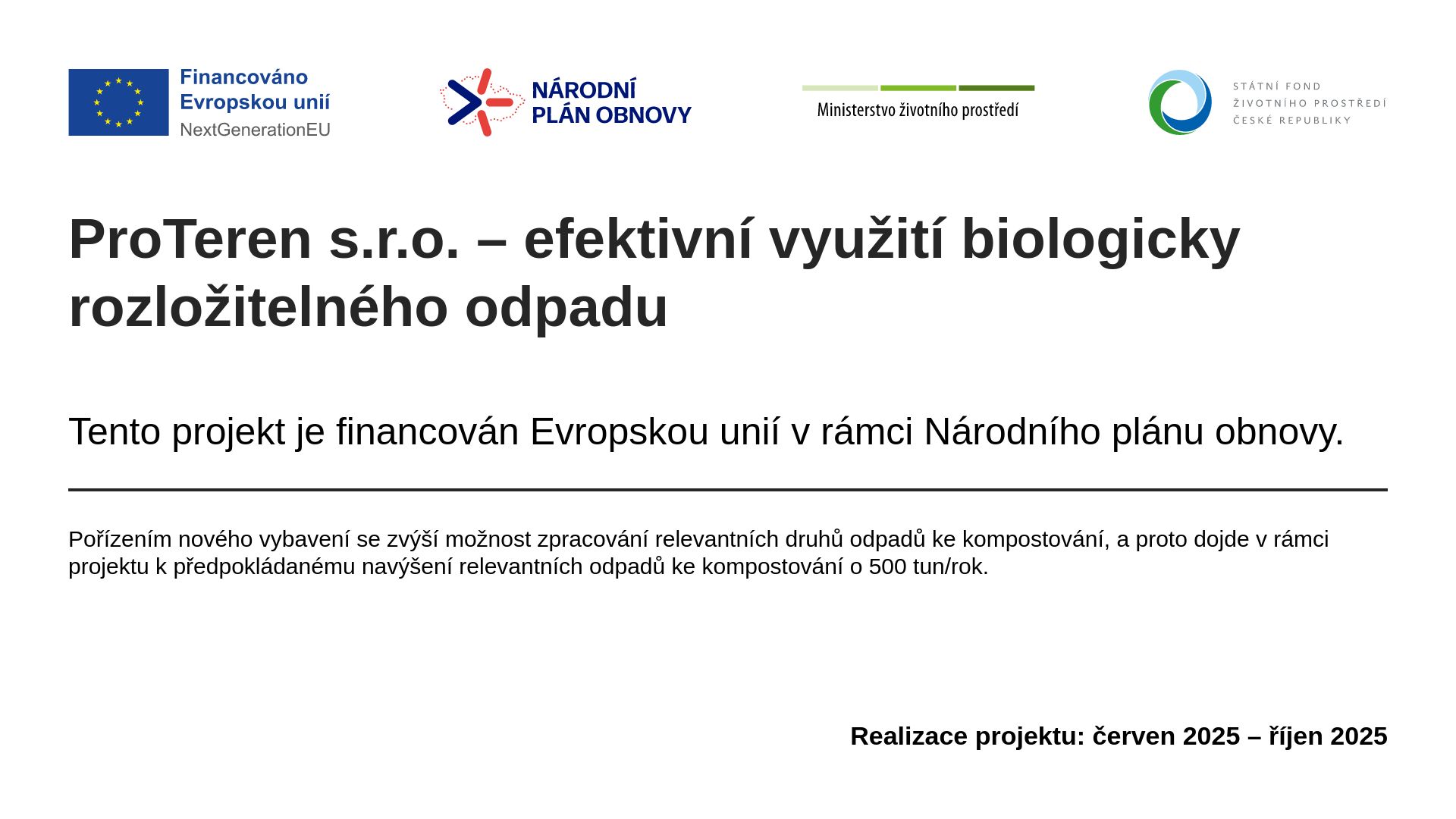 ProTeren s.r.o. - Využití inovativní technologie Cílem projektu je zavádění inovativních technologií při využívání stavebních a demoličních odpadů. Realizací projektu dojde k rozšíření potenciálu |