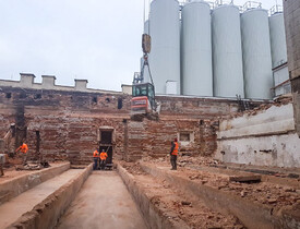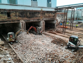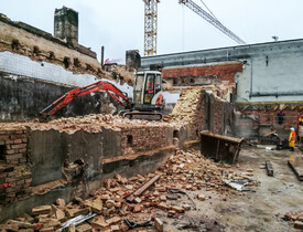 Demolice střechy a pater s vířivými káděmi nad klenbovým sklepením s původními ležáckými tanky. Provádění demoličních prací bylo prováděno s požadavkem na nenarušení statiky stávajícího klenutého podzemního podlaží historické části pivovaru, při zachování jeho výrobního provozu a zachování jeho funkce v rámci prohlídkové trasy pro návštěvy. Při demolici bylo využito zejména práce několika minibagrů se hydraulickými kleštěmi a kladivy. Pro přesun vybouraného materiálu se použila transportní cesta z pásových dopravníků o délce cca 50 m . Pro demontáže ocelových nádrží (spilek) bylo použito i ručního transportu za pomocí pákových kladkostrojů.