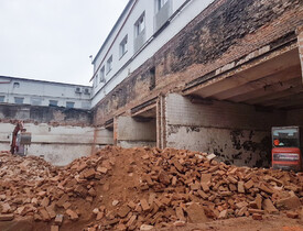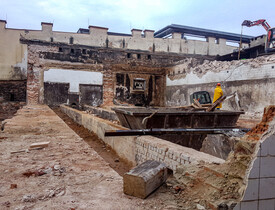 Demolice střechy a pater s vířivými káděmi nad klenbovým sklepením s původními ležáckými tanky. Provádění demoličních prací bylo prováděno s požadavkem na nenarušení statiky stávajícího klenutého podzemního podlaží historické části pivovaru, při zachování jeho výrobního provozu a zachování jeho funkce v rámci prohlídkové trasy pro návštěvy. Při demolici bylo využito zejména práce několika minibagrů se hydraulickými kleštěmi a kladivy. Pro přesun vybouraného materiálu se použila transportní cesta z pásových dopravníků o délce cca 50 m . Pro demontáže ocelových nádrží (spilek) bylo použito i ručního transportu za pomocí pákových kladkostrojů.